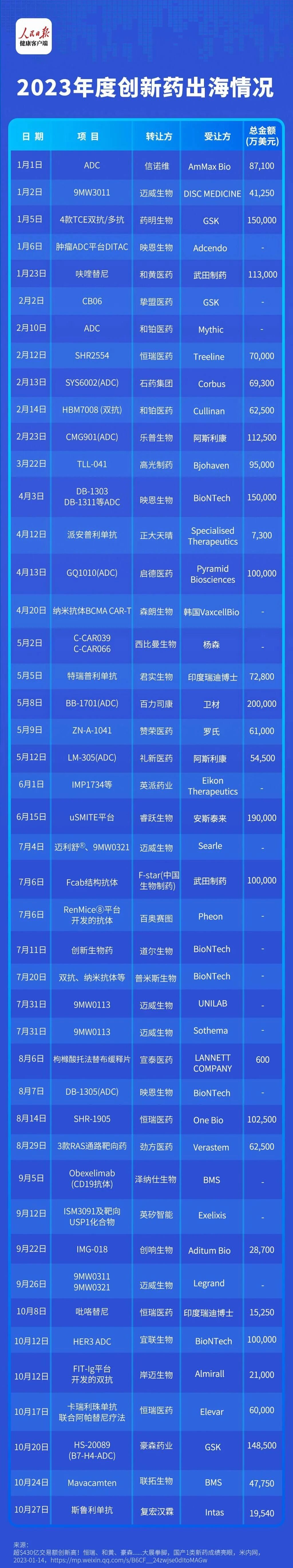 据米内网数据,2023年,至少有58个国内创新药项目达成出海交易,累计首付款超36亿美元,总交易额超430亿美元,单笔交易达10亿美元及以上的项目有19个,包括恒瑞医药的SHR-1905、HRS-1167和SHR-A1904、和黄医药的呋喹替尼、乐普生物的CMG901等国产创新药。魔方数据也显示,截至12月21日,国内共发生了近70笔创新药License-out交易。